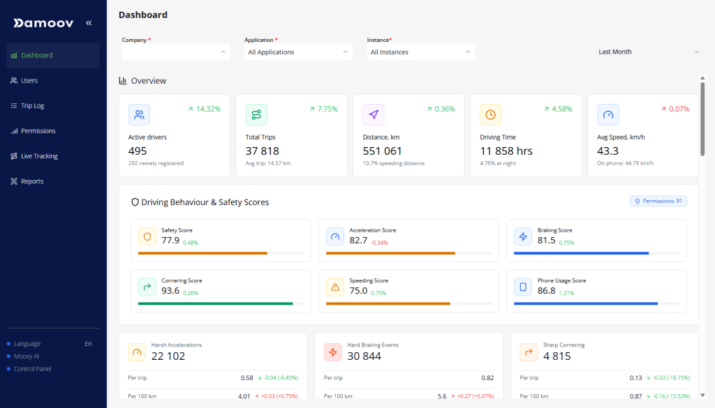 Understanding the nexus between driving behavior and ownership costs, we offer insights that empower fleet owners and individual drivers. Our goal is to minimize driving expenses, reduce environmental impact, and enhance fleet performance. With Damoov’s Eco-Driving insights, pave the way for a more efficient and eco-conscious journey.